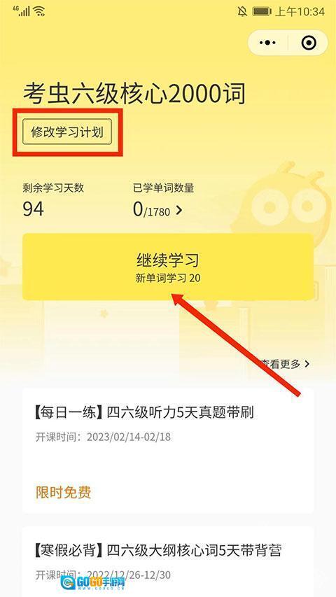 进入单词类型选择界面后,通过“修改学习计划”功能能够调整单词类型,接着选择“继续学习”这一选项。