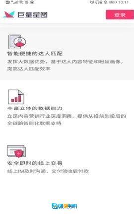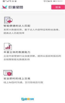 巨量星图是一款十分实用的手机视频推广工具,它了丰富多样的功能可供使用,同时界面设计简洁大方,操作也极为简便,全程无任何广告干扰。用户可以根据自身需求自由选择所需功能,借助这款软件能够高效推广各类视频内容,效果十分出色。软件支持一键提升用户的关注度、播放量等数据,实用性拉满;此外,平台还提供海量视频素材,助力用户轻松制作各类推广视频,体验感极佳。