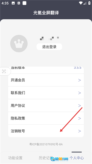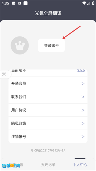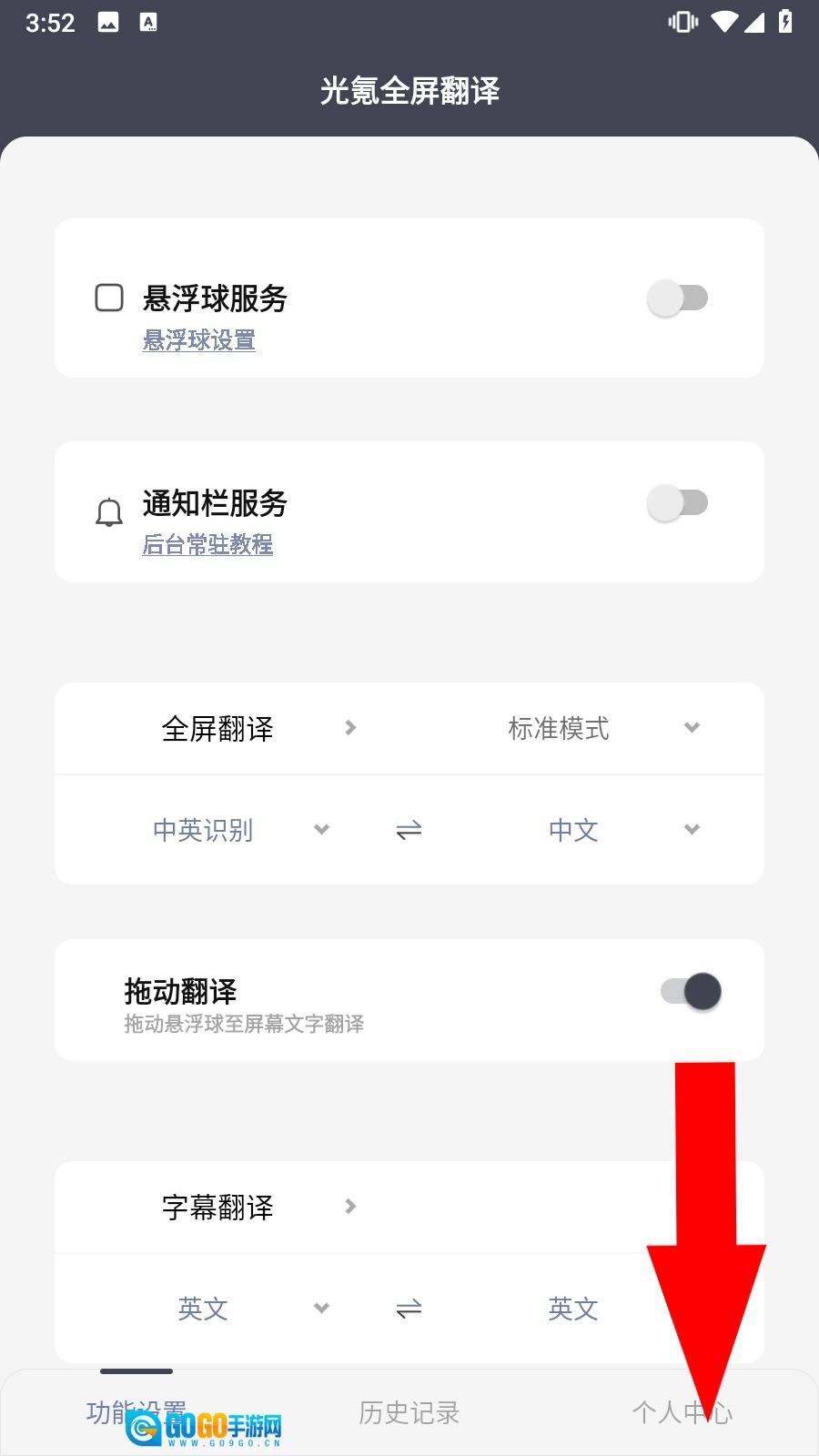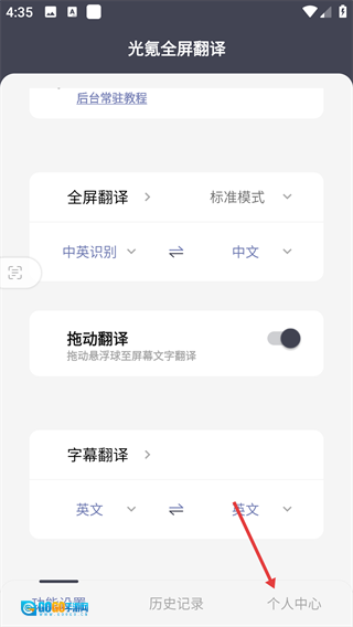 你可以先打开光氪全屏翻译,然后找到设置页面,在该页面底部点击【个人中心】。