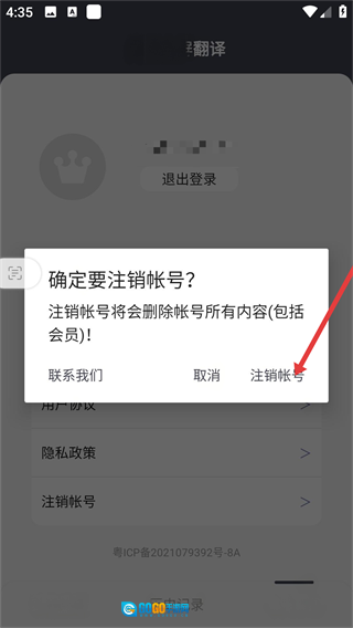在个人中心页面,点击“注销帐号”选项后,会弹出注销确认的对话框。