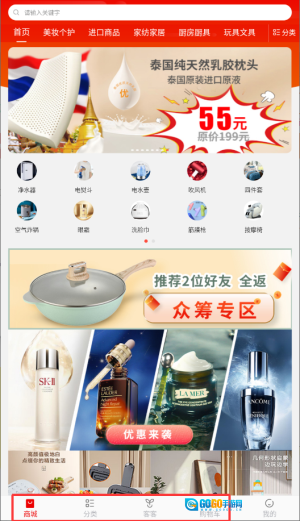 可以通过首页的分类导航栏选择商品大类,从而快速找到目标商品所在的专区。