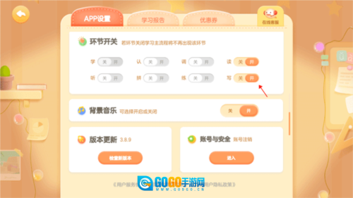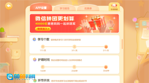 帮帮拼音App支持自定义学习环节,设置方法很简单:点击首页右上角的【用户中心】,就能自主进行设置了。