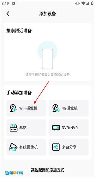 进入添加设备的页面后,能看到“搜索附近设备”和“手动添加设备”这两个选项,接着选择“WiFi摄像机”进入到配置页面。