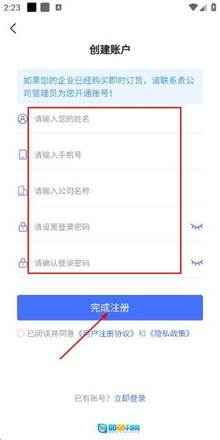 在账号注册页面填写相关信息,勾选对应的协议条款后,点击完成注册按钮即可。