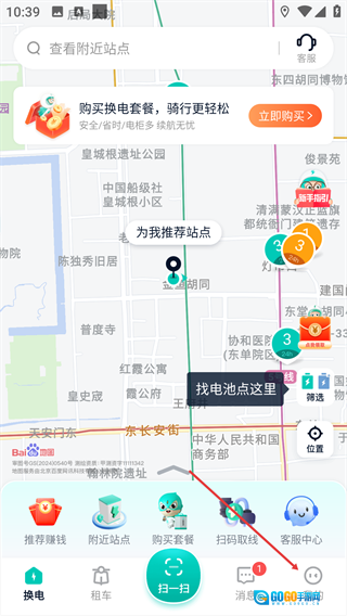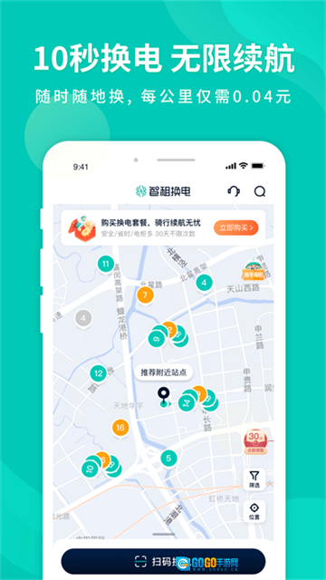 1u200c、智能导航与查询:地图实时展示周边换电柜的具体位置、可使用电池的数量以及车辆的分布情况,支持一键导航到距离最近的网点。