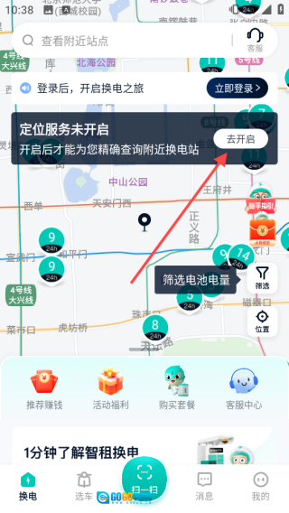 打开软件后,若弹出【定位服务未开启】的提示,可点击【去开启】按钮,这样就能更精准地查询周边的换电站了。