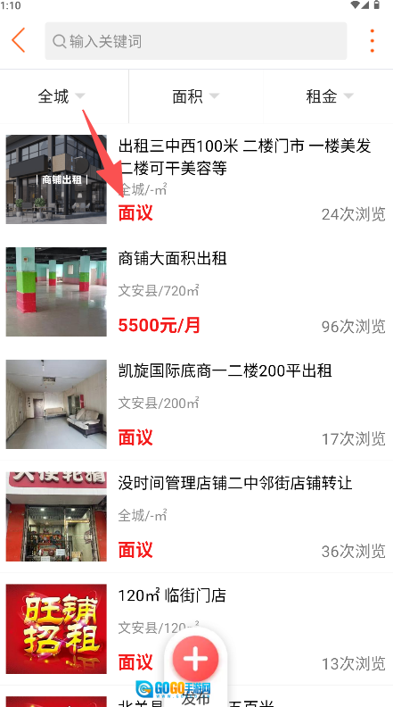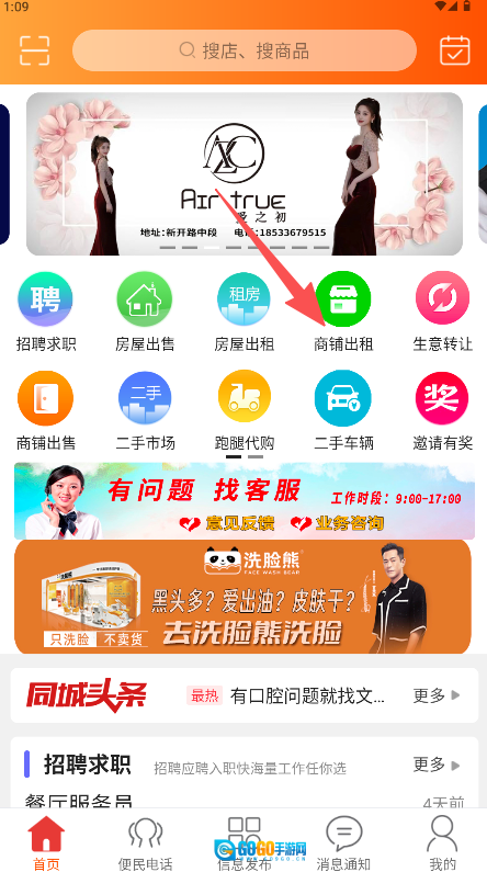 在首页点击“商铺出租”图标进入相应分类列表。