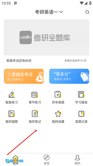 进入【题库】主界面后,可借助【智能练习】【章节练习】等功能入口,进行考研相关的学习与训练操作。