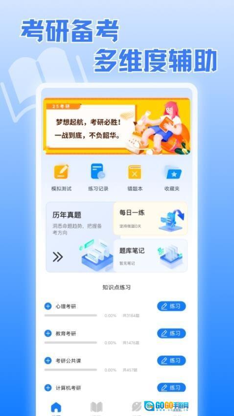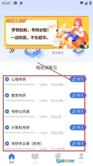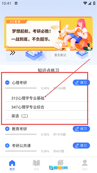 在【知识点练习】板块里,找到与考研相关的对应类目(比如【心理考研】),点击该类目右侧的【练习】按钮,就能进入相应科目的刷题环节了。