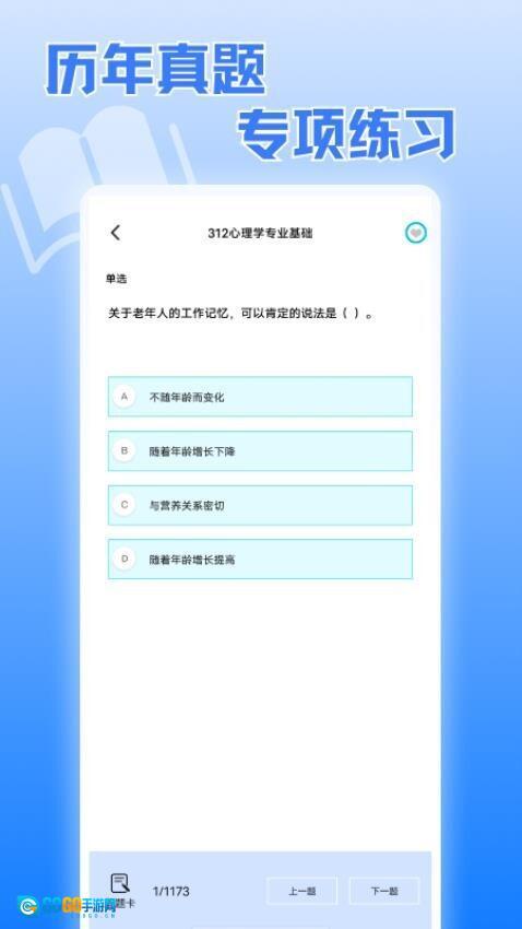 进入【312心理学专业基础】的【单选】题目界面后,完成当前题目可点击【下一题】继续练习,也可以借助【答题卡】进行题目跳转。