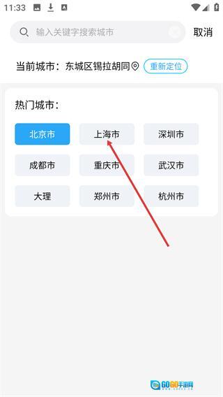 进入城市选择页面后,可在【热门城市】板块中挑选城市选项(例如上海市),以此完成目标城市的添加选择操作。