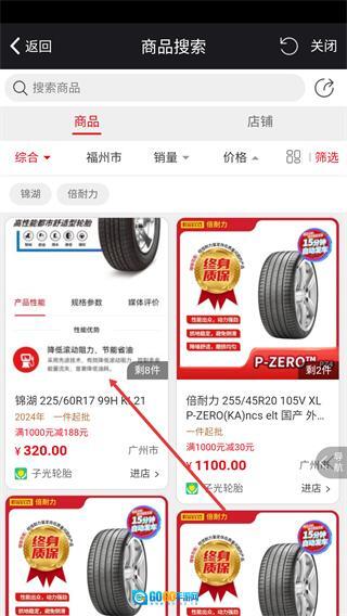 在轮胎商品列表里,找到你想查看的目标轮胎(比如锦湖225/60R17这一款),点击对应的商品就能进入它的详情页面了。