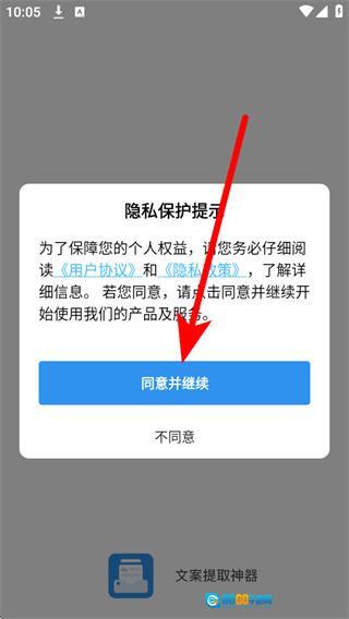 打开文案提取器后,在弹出的窗口里点击“同意并继续”按钮,就能进入到主界面了。