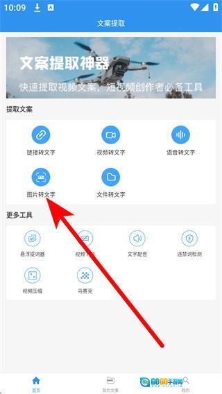 在主界面的提取文字板块里,点击图片转文字选项,即可进入图片提取文案的操作页面。