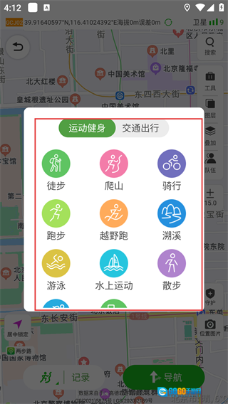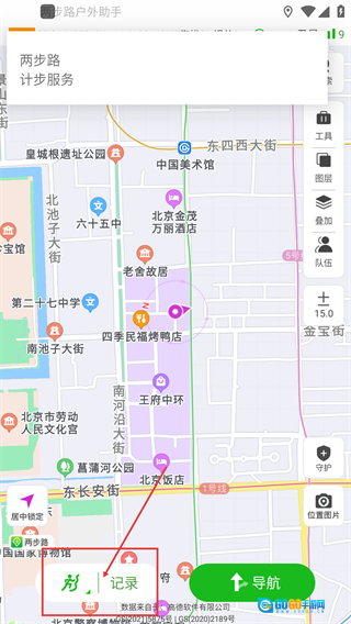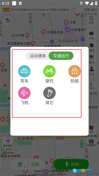 进入主界面后,点击底部的【记录】按钮,会展开类型选择菜单,借助该菜单能够开启户外或出行的轨迹记录功能。