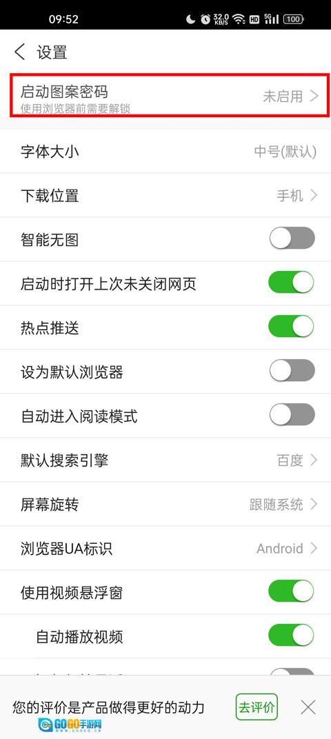 在设置页面的第一行找到启动图案密码选项,点击该选项以启用它。
