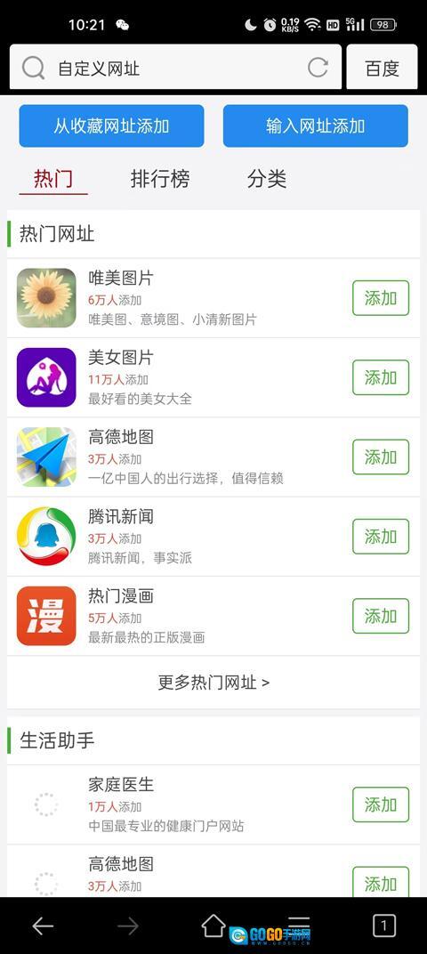 当你想添加书签时,点击首页众多书签下方的“+”号,就能进入添加书签的界面了。