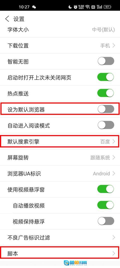 当你需要将其设为默认浏览器、切换搜索引擎,或是想添加脚本时,都可以进入设置页面,再点击进行相应设置。