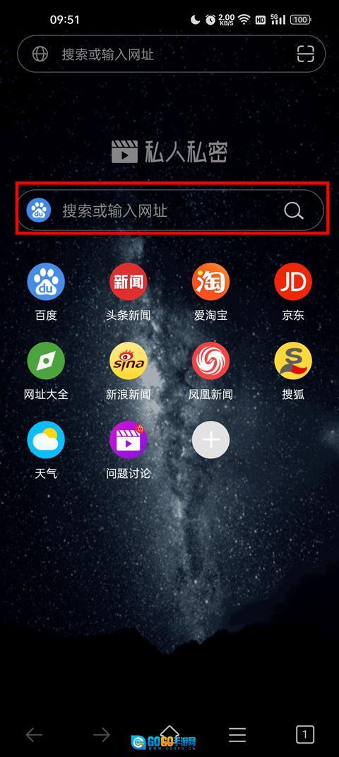安装进入首页后,若需要使用浏览器进行搜索,直接在首页的搜索栏操作即可完成搜索。
