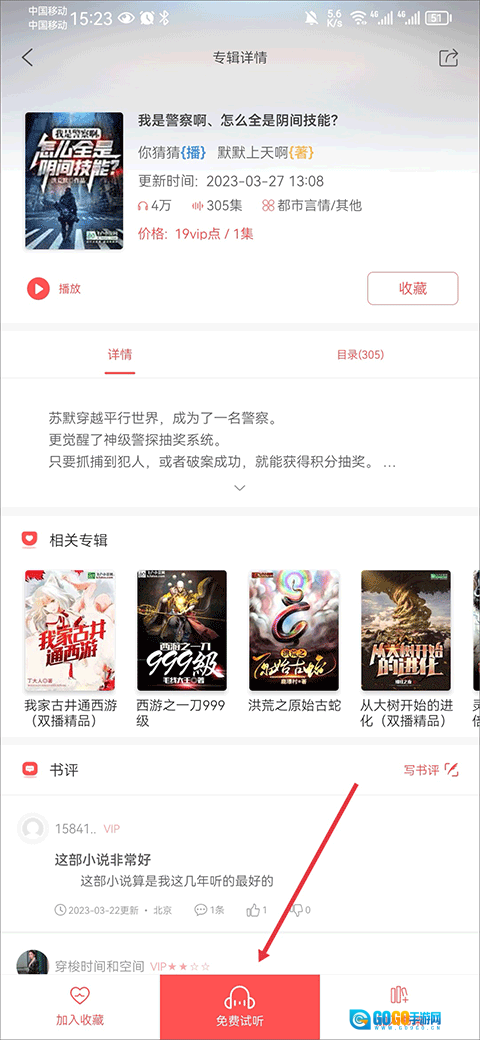 进入书籍详情页面后,点击“免费试听”按钮,就能进入播放界面开始听书了。