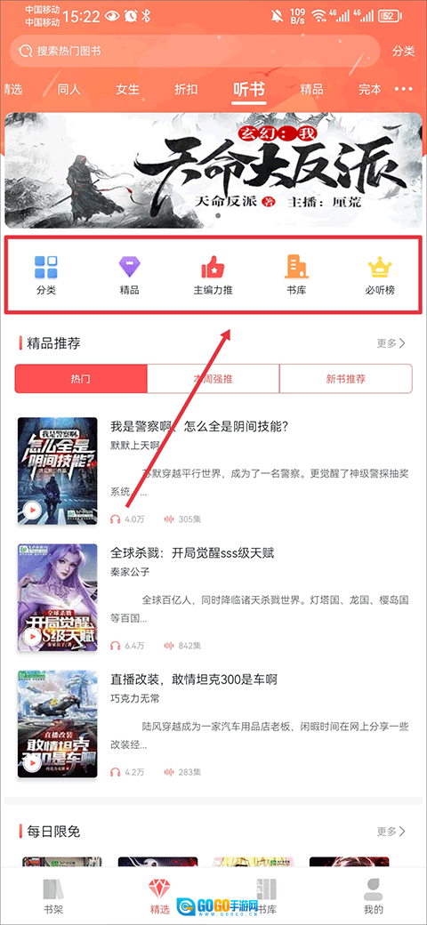 在精选页面里找到听书板块,接着你能通过分类、精品、主编推荐、书库、必听榜单这些方式挑选自己感兴趣的书籍。