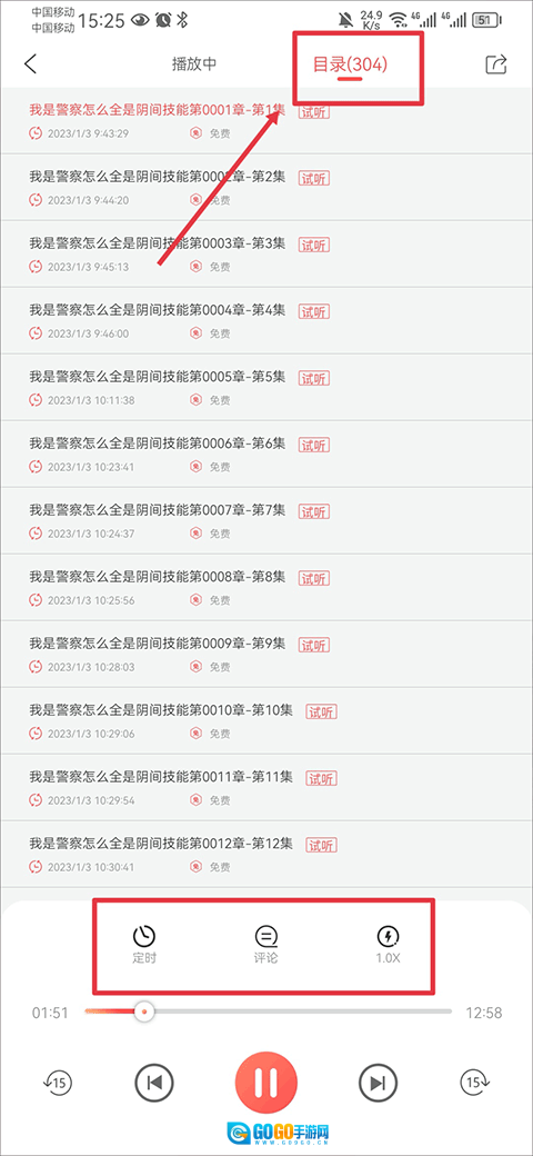 在播放界面里,你还能设置定时、调节播放速度,也可以在目录中自由切换想要收听的章节。