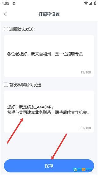 在打招呼设置页面,对进圈-首次私聊的默认发送内容进行配置后,点击【保存】按钮,即可完成该功能的设置。