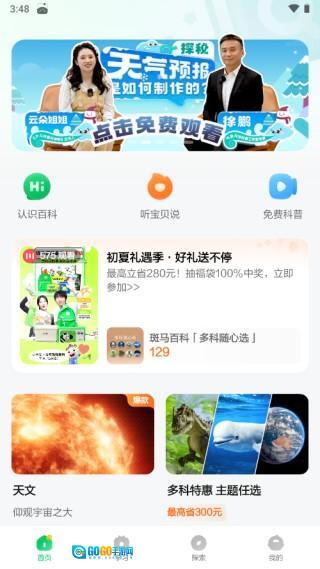 软件进入界面后能看到丰富的知识内容,包括知识百科、听宝贝说、免费科普等板块。