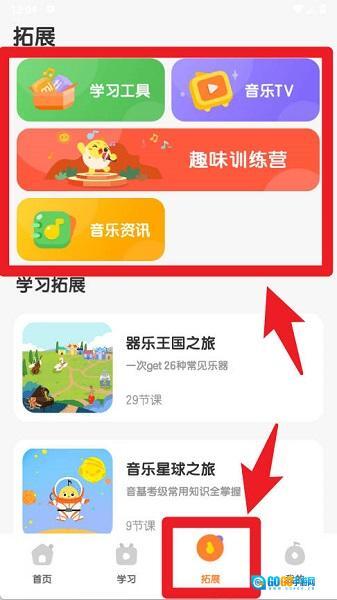 在拓展板块,用户能够进入学习工具、趣味训练营以及音乐资讯等功能区域,以此丰富孩子的音乐学习途径。