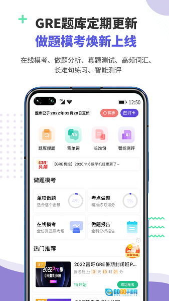 高频词库涵盖GRE核心3000个单词以及同义替换词组,提供词根记忆、例句应用功能,并配有智能复习计划支持。
