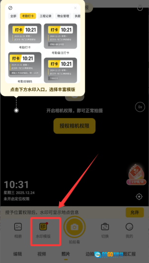 进入软件后点击红色框框中水印模版选择拍摄。