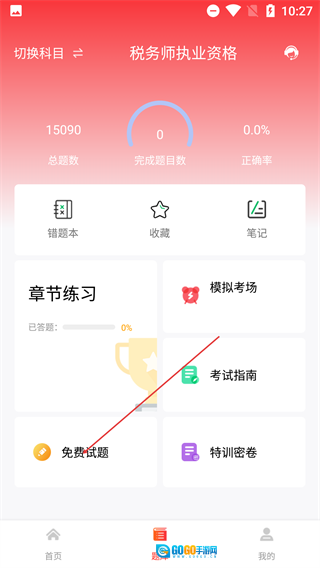 首先通过【切换科目】功能选择【税务师执业资格】,接着点击底部的【题库】按钮,进入题库页面后即可使用刷题功能。