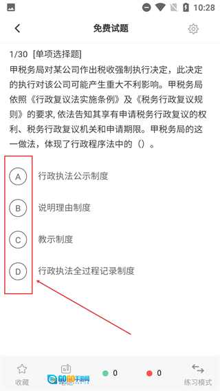 在题库页面能够查看【总题数】【完成题目数】之类的数据,点击【免费试题】入口,就能进入试题练习界面。