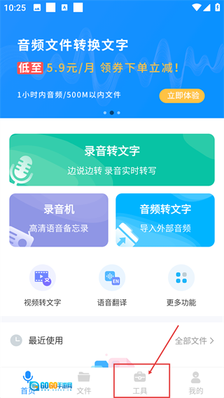 在音频转文字软件的首页,点击底部的【工具】选项就能进入工具页面,首页里还设有【录音转文字】、【音频转文字】这类核心功能。
