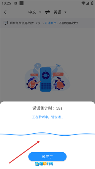 启动语音翻译功能后,界面会呈现【说话倒计时:58s】的提示以及聆听状态标识,当语音输入结束,点击【说完了】按钮就能完成该次翻译操作。