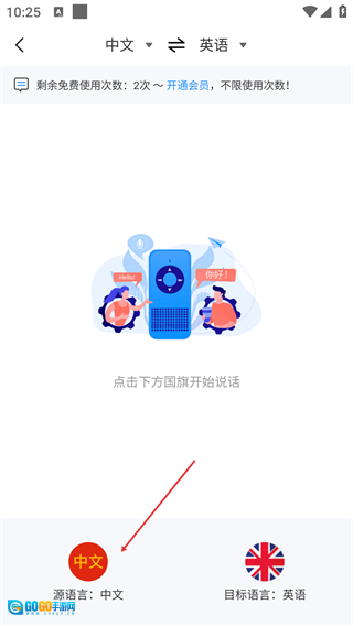 在【语音翻译】页面,先确认源语言是【中文】、目标语言是【英语】,之后点击底部对应的语言按钮就能启动语音输入了。