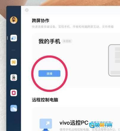 在电脑上启动办公套件,找到左侧的对应按钮并点击,然后在弹出的界面里,找到“手机/平板连接”相关区域的“连接”按钮并点击。