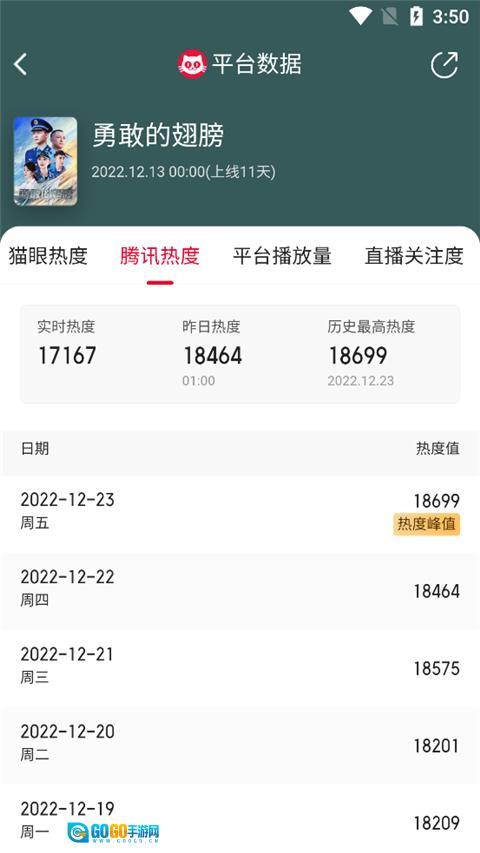 进入猫眼全网实时热度页面,能看到猫眼热度、腾讯热度、平台播放量、直播关注度等各类数据。