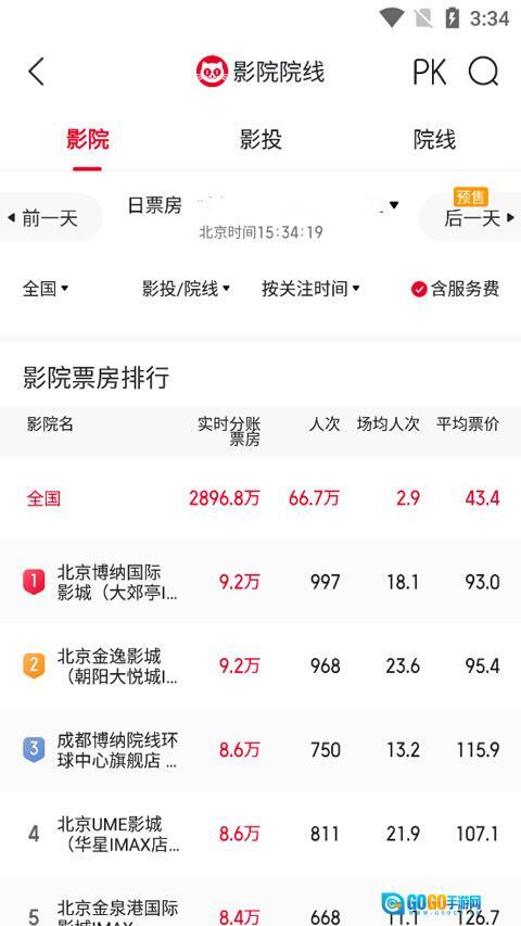 为用户提供综合影院票房排名服务,用户还能根据票房从高到低、观影人次从高到低、上座率从高到低等不同维度进行排序。