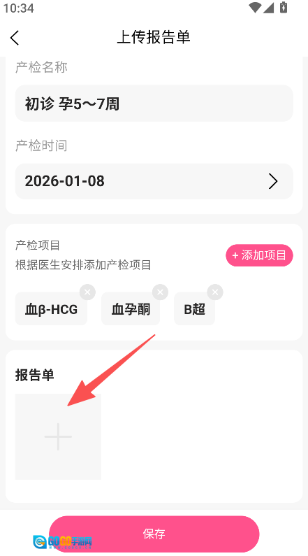 可以在上传报告单的页面添加产检项目并上传报告,操作完成后点击保存按钮,就能记录下产检信息。