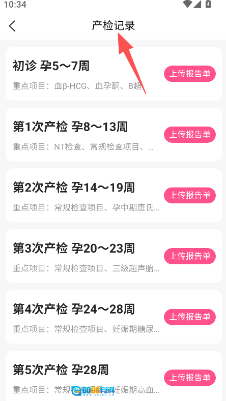 在产检记录页面点击对应孕周的上传报告单。