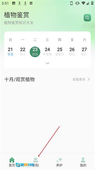 在【植物鉴赏】的首页里,点击底部导航栏中的【识别】选项,就能进入植物识别功能页面。