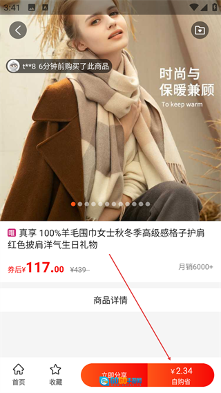 进入商品详情页面后,你可以查看该商品的图片与文字介绍,同时也能点击【立即分享】或者【自购省】按钮来完成相应的操作。