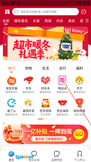进入应用首页后,既可以利用搜索栏查找商品,也能够选择【唯品会】等平台入口,从而进入相应平台的商品推荐页面。