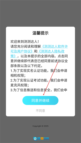打开【测测达人】应用后,仔细阅读并确认协议内容,接着点击【同意并继续】按钮,这样就能完成协议确认步骤,进而进入应用使用各项相关功能。