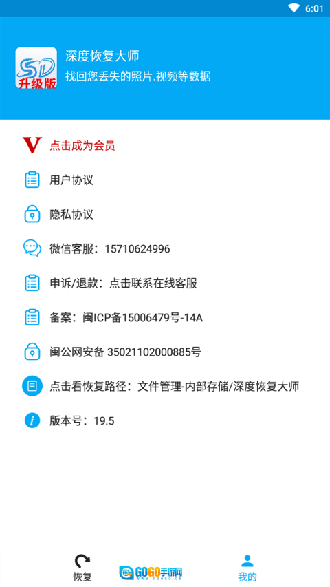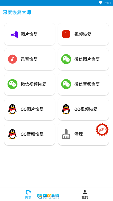在【深度恢复大师】的界面中,你可以选择【图片恢复】【视频恢复】之类的功能,还能点击底部的【我的】进入相应板块。