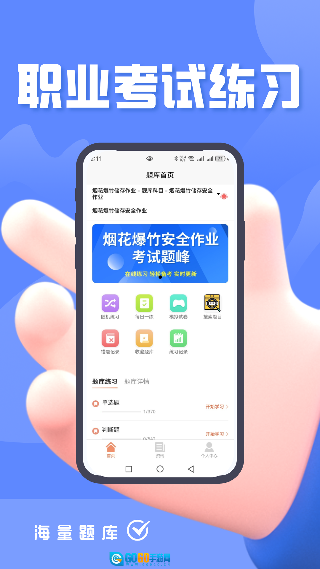 完成登录操作后,您将进入题库的首页界面。这里提供了丰富多样的题目资源供您进行刷题练习,您只需点击页面下方的“资讯”板块即可。