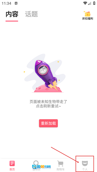 进入内容页面时,要是遇到加载失败的提示,可以点击【重新加载】按钮再次尝试,或者通过底部导航栏的【个人】按钮进入相应页面。