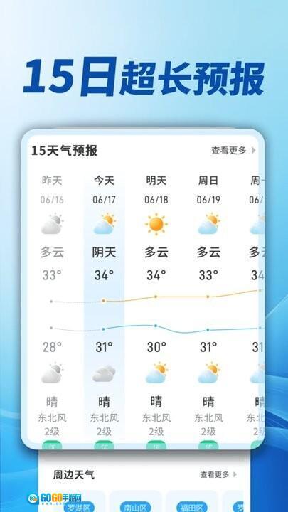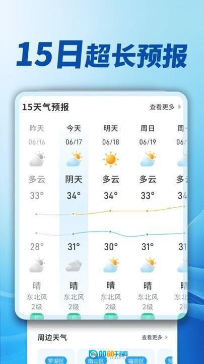 精准天气,用户可精准查看,天气预报极为精准,还能欣赏到美观的天气变化展示。