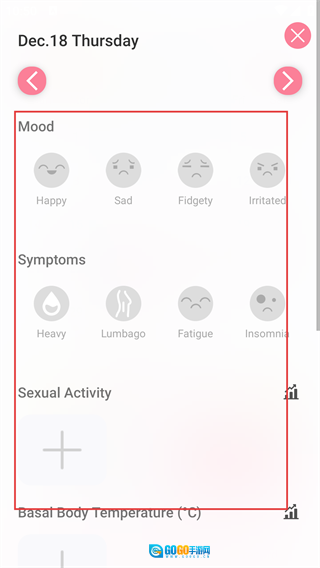 记录页面设有【Mood】【Symptoms】等不同分类板块,每个分类下都包含若干选项,用户能够根据自身需求挑选对应的选项来完成记录操作。
